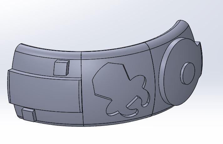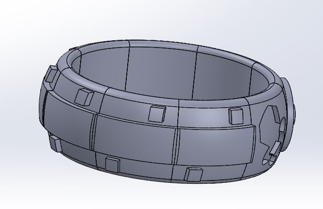 I decided to take our pier into the design. Viewing the pier from above, I wrapped a simple design around most of the wedding band and did an extruded cut into the band of a ring pop. I designed the ring using SolidWorks in a simple design utilizing a revolving array. In concept, I only created 3 of the sections, then completed the ring with a revolving pattern.